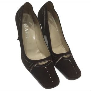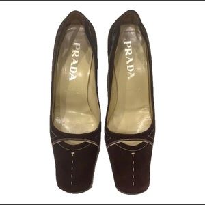 Size 36 1/2. Prada. Vintage, early 2000s. Brown suede with contrast cream stitching all around the shoe. Suede is buttery soft, no rubbing on the front. These are in amazing condition with very minimal wear around the shoe. Barely worn, like new condition. Some marks on bottom of the shoes. Not seen when worn. See last picture.
