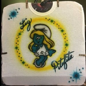 This is one of our SMURF Airbrushed T-shirt designs. The sample shows the girl SMURF with the phrase, "Feeling Smurfy," small, in the upper left chest area. But it's normally done full-size across the shirt. You can get the same phrase, or the character's name, or your name. It comes on any size shirt up to 6X. Kid sizes, too. It can also be put on sweatshirts, hoods, and more. Just check with us for the price differences. Any questions, please don't hesitate to ask.