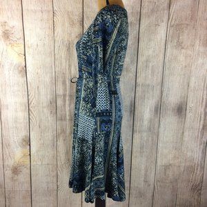 Blue geometric patchwork design 3/4 sleeve fit & flare swing dress with matching string belt by LRL Lauren Jeans Co by Ralph Lauren.