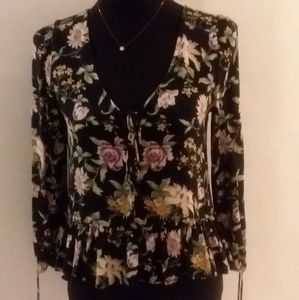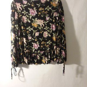 American Eagle Outfitters Black floral long sleeve blouse with pleated high/low hem design, relaxed tie detail. Fabric is soft and subtle. Nice feminine look.