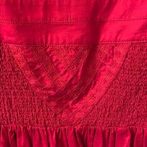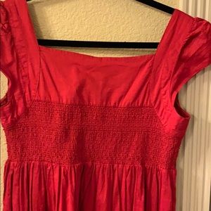 Red smocked dress empire waist fits more like a 6 or 8. Bodice is stretchy so the fit is very flexible. I have red Italian leather shoes that match and I do a bundle discount. Would make a good holiday dress