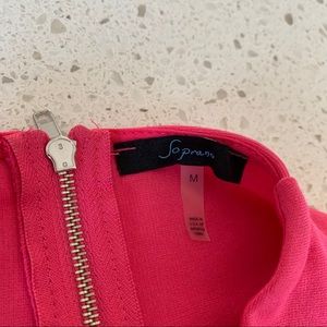 NWOT! Gorgeous bright magenta dress by Soprano. Size medium in juniors. Purchased from Von Maur Dept store for an event but went with something else. Extremely flattering plunging neckline with high neck in back, exposed zipper in back for a bit of edge, flared skirt. So cute! 15” pit to pit. Waist is 13”. Just under 37” from top of shoulder to hemline.