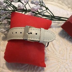 So sleek and clean with tiny CZ at 12:00. Gold tone watch and bone leather band. Needs New Battery. 🌷🌷🌷