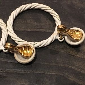 💥1980’s White cable Monet Hoop Clip Earrings. Hoop is a little over an inch. Very good shape. Looking close they have a couple of slight scuffs. Not noticeable.