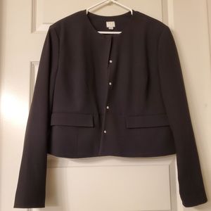 This is a cute black collarless blazer from Target. It is 22 x 22 inches and features snap closure, or you can leave it open, which is how I typically preferred to wear it. You can style it with the sleeves full-length, bunch them up, or roll them up.