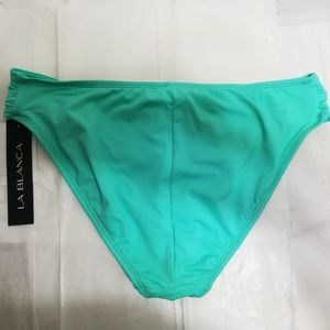 Full-coverage bikini swim bottom, featuring shirred side tabs and center seam at seat.