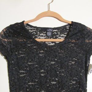 Rue21 Junior Black Sheer Lace Tee Top. Scoop Neck. Stretchy. Cap sleeves. Never Worn. Tags are from an outlet - NOT the original manufacturer tags. Please see photos for details.