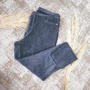These pull on pants have an elastic waist band and are a thin corduroy like material