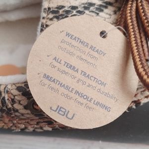 Cute, comfy & warm JBU by Jambu slip on weather ready duck shoes to keep you warm & dry in all types of weather. Python snakeskin top with 360° lacing. Cream faux fur lining. Cushioned footbed. Grippy traction coral rubber sole. Style is GWEN.