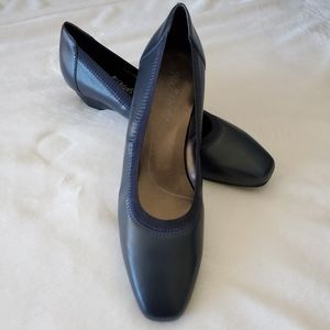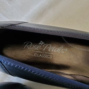 Comfortable Rose Petals "Brandi" Sz 9.5 Narrow, low dress pump with square toe and elasticized topline. Synthetic outer, with rubber sole and 1" heel transitions into a very low wedge.