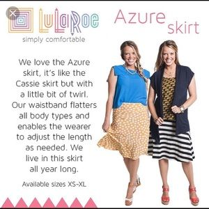 NWT Women’s Lularoe Azure a-line or skater fold over skirt size XL (fits more like a LARGE). Super comfortable and stretchy! Great for the office, church, date night or just shopping around town. Pair it with heels, sandals, flip flops, sneakers with a tee or tank top. Clean smoke free home.