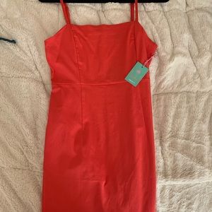 New with tags Forever 21 body con Coral dress. Spaghetti straps, zipper on back. Never worn. Size large.