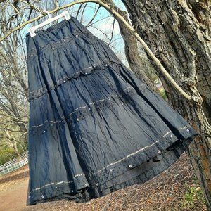 Boho Skirt Vintage Beaded Skirt Gypsy Long Skirts for Women Cotton Bohemian Hippie Clothing Gypsytyle Belly Dance Festival Skater Embroidery. All Cotton Beaded Long A-line Full Skirt Beading Embroidery Details within the trim. Lovely Gift idea Perfect Festival Clothing. Size on tag is Small but fits like M or L with Draw String Waist and Full Lining. Fabric is medium thickness w/crinkly effect and slight sheen. Twist dry.