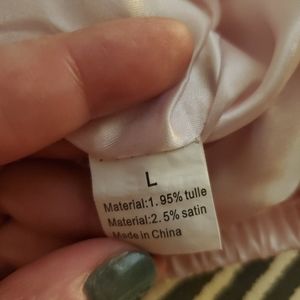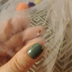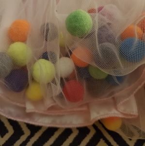 PomPom Tutu Skirt. Pink tulle skirt with satin lining. Elastic waist - approximately 8.25" across when flat. Tulle filled with colorful pompoms about 1/2" in diameter. Few tiny holes hidden in the folds of the tulle. They are not big enough to fit the pompoms.