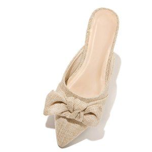 An easygoing mule gets retro-chic style, perfect for any occasion, these flats feature a cushioned insole and a sassy pointed toe. The body is designed with woven linen material and is shaped to flatter your foot and provide maximum comfort. Lastly, an over-sized knotted bow on the toe pulls the shoe together!