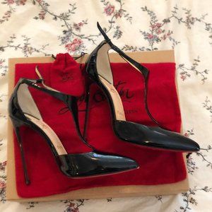 Christian Louboutin J String Heels in Patent Black. Category: Sky High (4.7 in.)