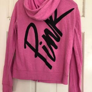 PINK brand zip up sweatshirt in pink. Black dog on front with black writing on back with hood.