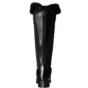 Over-the-knee boot featuring quilted shaft featuring drawstring pull with eyelet hardware