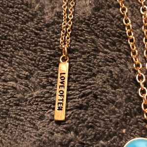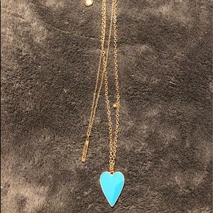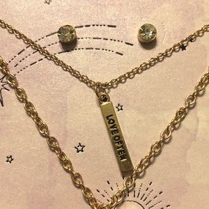 Brand new BCBGeneration 3 pc box set. Double strand Inspirational necklace. Beautiful turquoise color enamel heart(1”) and “love often” bar charm. Tiny pink dangle hangs a little higher up the chain. Chains are 18” w/3.5” ext. w/crystal post earrings.