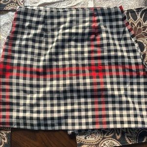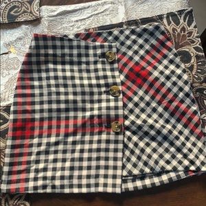 Like New skirt only used once. Measurements are 17” long from highest material to bottom of skirt and 15” across waist laying flat. This skirt is suppose to be alittle Asymmetrical please see all pics. Large front buttons. Colors of black, cream and red. Cute skirt. Not a thick skirt see material listed on tag.