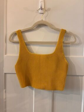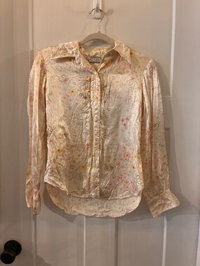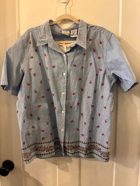 In very good, preowned condition. Peach/coral colored with green palm leaves throughout the skirt. Elastic waist band. Please feel free to ask any questions!