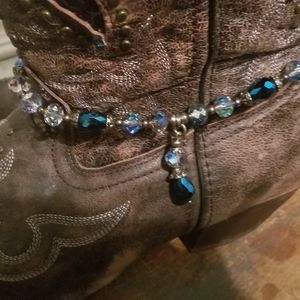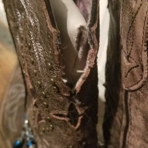 These were worn only a handful of times. Ibhave a photo of the wear. They are more like broke in. The were altered professionally in the back to accommodate a larger calf. Ingot married in these boots and saw Kenny Chesney in them at Ford Field in Detroit. The boot braclet is beautiful and comes with the boots as a freebie.