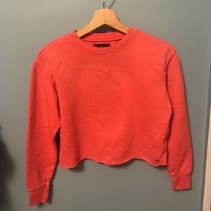 Trendy cropped sweatshirt in good condition. This pullover is very comfy with a cute, relaxed look. There is light wear throughout fabric (see photos) and a small stain I noticed while photographing, I haven’t tried to get it out.