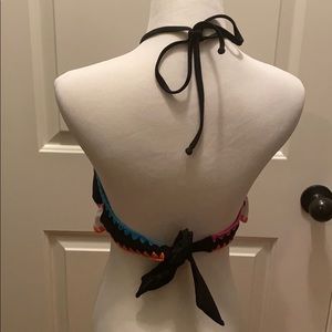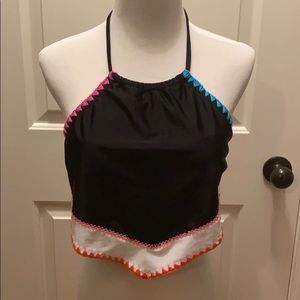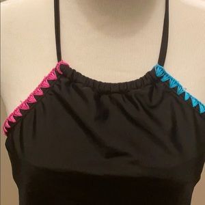 The tankini fit with a v-hem flaunts and slims your silouhette, and a sophisticated hi-neck cut is supported with ties at the neck and in back.