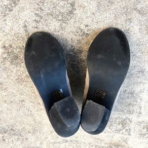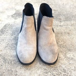These adorable suede heeled booties are a warm gray/tan suede with black elastic signature Chelsea cut