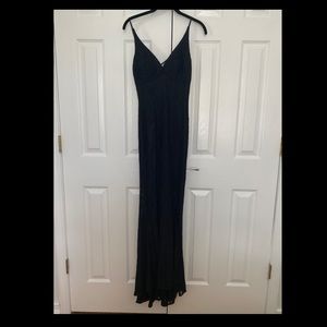 Black lace gown with crossed straps in back. Back of dress is floor length with a short train and the front rises up a little.