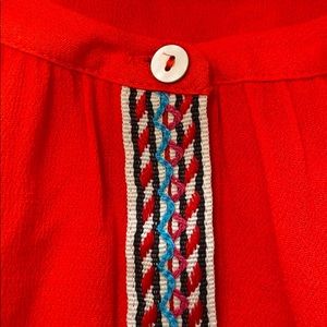 This beautiful 100% rayon top was only worn one time and is in perfect condition. Pleated around the collar front and back with a coordinated ribbon detail on the middle of the front. This top looks good with jeans, skirts and even shorts.