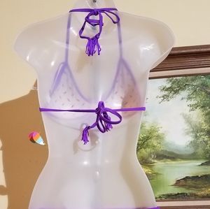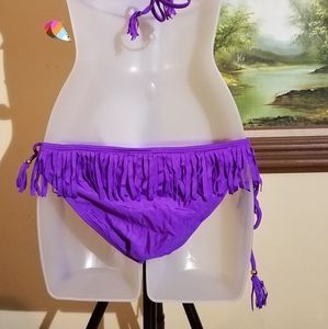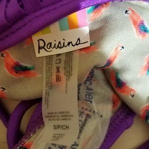 Raisins bikini set top and bottom has fringe on top and removable cup pads,bottom has side ties and back fringe inside has a parrot pattern see pictures