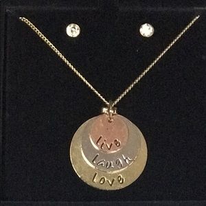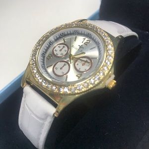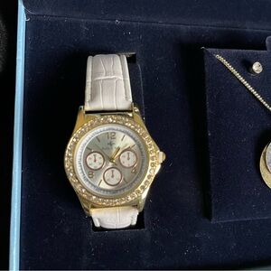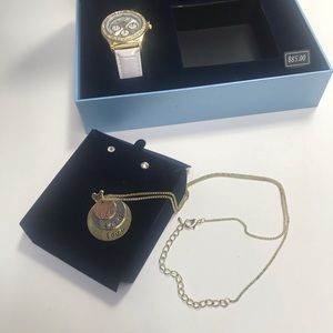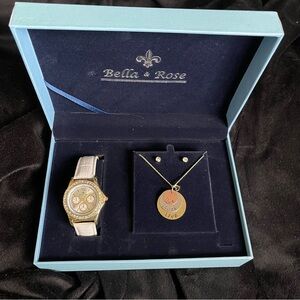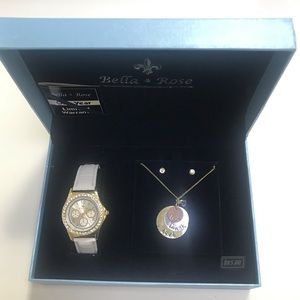 Bella & Rose Watch with white faux skin band, multiple dials in the face outlined with crystals, Necklace has 10”-12” chain & Crystal Earrings with comfortable rubber backs all in original gift Set box