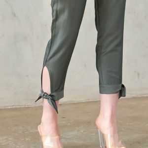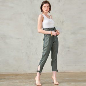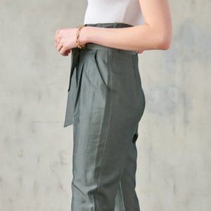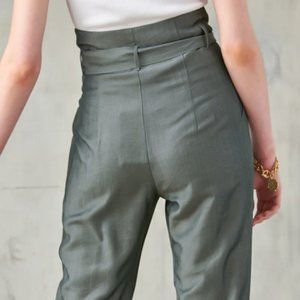 On trend belted paperbag pants with ankle tie detail in gray olive. Beautiful silk like sheen & feel. 2 front pockets. Zip close. Flattering for all body shapes. Lightweight. Fabric: 70% Cotton 30% Polyester. NWT. So cute & can be styled dressy or casual.