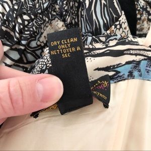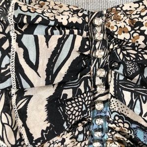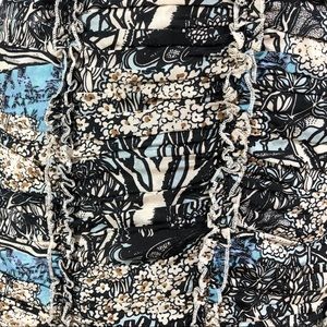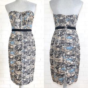 Plenty Frock by Tracy Reese strapless cocktail dress. Allover ruching is very figure flattering. Floral/ forest print in tones of cream, blue and black. Embellished detailing at chest. Velvet band at waist. 100% silk. Back zip. Interior elastic band enhances fit. Fully lined. Approx measurements laying flat: chest - 15.5”, waist - 13”, length - 32.5”. Gently worn with no holes or stains
