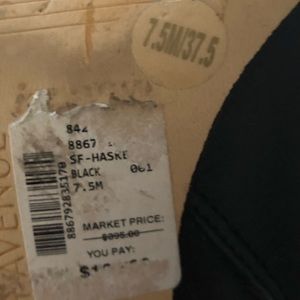 Black tall boots with gold accent sz 7.5, with side elastic band 3 in heel. Worn a few time