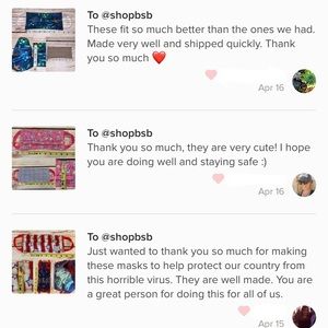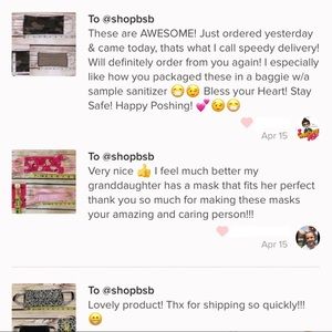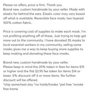 No lower prices/no discounted shipping. These are set to sell as priced. 5% bundle discount is not a option. No offers please!!! I am FIRM on my prices for ALL masks! I took off $2-$5 per mask!! Fees are so high on poshmark. I am FIRM in my pricing now until I sell out of masks.
