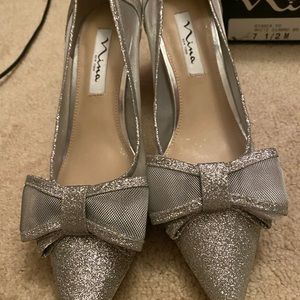 Nina Bianca white diamond dress shoe. This pump is a glittery silver, kitten geeked pump with bows on the front! Super cute for and feminine for that added touch of bling!