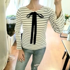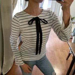Black white thin stripe, long sleeve, keyhole below velvet bow, crewneck