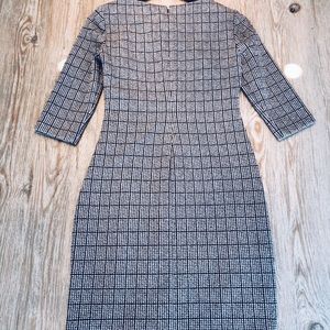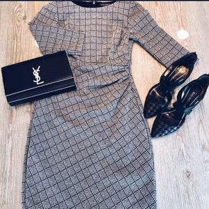 Houndstooth pattern, slim-fitting, knee length, jacquard dress.