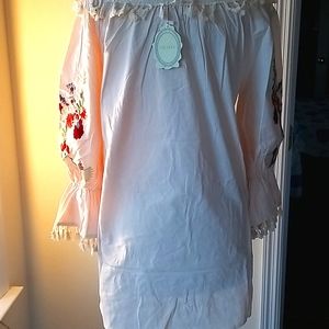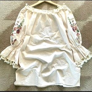 This cute dress hit right above the knee on most, 30" in length. Made of 100% cotton, has gorgeous embroidery details on the front and sleeves. Tassler fringe around the round neckline ( can be worn on shoulders as well)and sleeves. Very cute for fun events or even a dressy event. I'm sure can be worn as a Tunic with shorts or leggings too! Be a free spirit and grab this off white colored dress! Sleeve length 21".