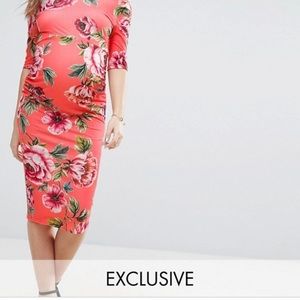 ASOS floral Bardot 3/4 sleeve coral maternity bodycon dress. Designed to be worn off the shoulder, but is more like a boat neck (see 2nd picture of me wearing it).