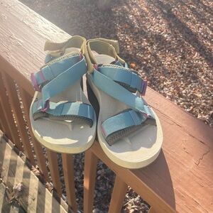 Super cute shirt with a blue, pink and aqua design on the front and darker blue on sleeves and back. Back zipper.