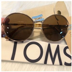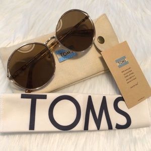 TOMS 58mm “Blythe” Round Sunglasses NWT Gold & Brown. Brand new, no flaws. Comes with soft canvas case & cleaning cloth. Round gold colored metal frames with brown lens.