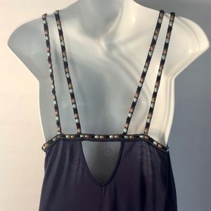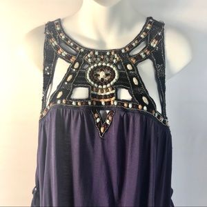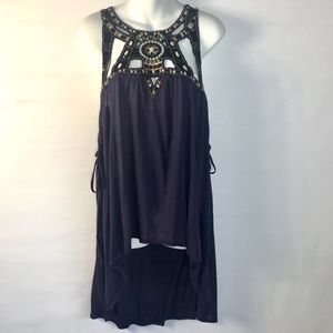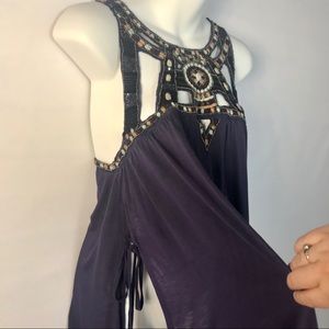 Gorgeous beaded tunic top from Free People with a hi-low hem. Geometric cut-outs with embroidery and beadwork. Sleeveless. Side slits with ties. 100% viscose. Brand new with tags, size extra small. Measures approximately 27” length in front, 35” in back, 17” armpit to armpit.