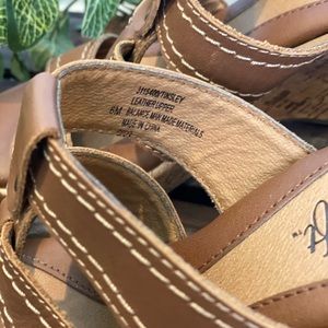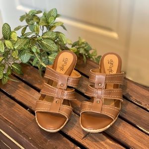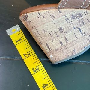 Euro soft wedge sandal heels. Kick up your heels in this charming leather sandal. A nicely cushioned footbed gives you comfort. 4" cork-wrapped heel with 1" platform. Along top of the back of heel a little chipping/flaking.