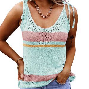 Sheer breathable knit fabric with a stripe pattern and exquisite hollow-out throughout the shirt. Sleeveless style with self-tie shoulder detail. Stunning for a date night or even a night out with the girls. Sexy tank tops add a subtle glow under a layer or make a statement on its own.