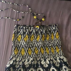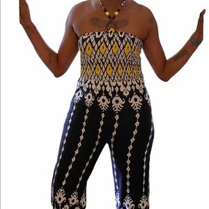Cute summer romper/jumpsuit. Halter neck tie with accent beads, ruched bodice with wide leg pants.
