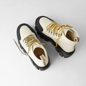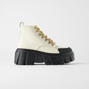 Super cool Zara boots, gently pre-owned. Worn twice, the thick sole ended up being a little too tall for me. Size 39 which fits like an 8/8.5 - this size is sold out online. I'd say they run a tad big and could also accommodate a 9.