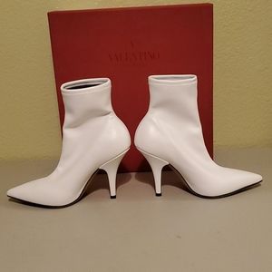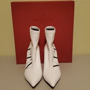 White flex leather, pointed toes ankle boots with VLTN logo accent at side. They are white logo VLTN sock booties. Fit...this style typically runs a half size to a full size small. Heel is 4 inches high. Bought a shoes from Neiman Marcus.